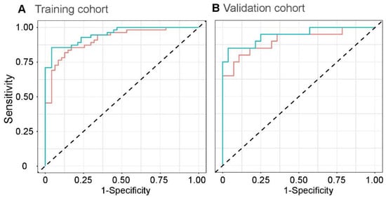 The discrimination of radiomics and the combined model. Receiver operating characteristic (ROC) curves of the radiomics score and clinical characteristics combined radiomics features under linear discriminant analyses in the training (A) and validation (B) cohorts.