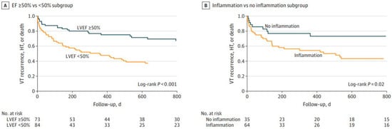 Outcomes of VT ablation in CS stratified by baseline (A) LVEF ≥50% vs. <50% and (B) presence vs. absence of active myocardial inflammation. Kaplan–Meier survival curves for the composite outcome of VT recurrence, heart transplant, or death. Reproduced with permission from Siontis et al. [42].