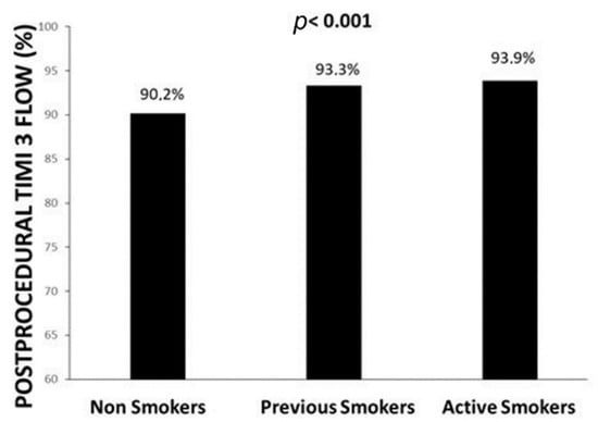 Our population is represented by 16,083 STEMI patients. A total of 6819 (42.3%) patients were active smokers, 2099 (13.1%) previous smokers, and 7165 (44.6%) non-smokers. As shown in Table 1, active smokers were nine years younger and more often males compared with non-smokers. Smokers were less often affected by diabetes (p < 0.001), hypertension (p < 0.001), and hypercholesterolemia (p < 0.001), with lower prevalence of previous STEMI (p < 0.001), previous PCI (p < 0.001), or CABG (p < 0.001), but more often had a positive family history of CAD (p < 0.001). Smokers had a shorter ischemia time (p < 0.001), less often had anterior MI (p < 0.001), cardiogenic shock (p < 0.001), and out-of-hospital cardiac arrest (p < 0.001), but more often rescue PCI failed after thrombolysis (p < 0.001). Angiographic features are displayed in Table 2. Smokers less often had multivessel disease (p < 0.001), in-stent thrombosis (p < 0.001), received less often a mechanical support (p < 0.001) or underwent additional PCI (p = 0.001), whereas they received more often a coronary stent (p < 0.001), a DES (p < 0.001) and DAPT (p < 0.001). Despite the impaired preprocedural recanalization (p < 0.001), smokers had a significantly better postprocedural TIMI flow as compared to non-smokers (p < 0.001) (Figure 1). A significant association was observed with the percentage of SARS-COV 2 positive patients, and less often observed among smokers. Our main results were confirmed in both pre-COVID (p < 0.001) and COVID era (p < 0.001), and in both young (p < 0.001) and elderly patients (p = 0.013) (Figures S1 and S2). The results were additionally confirmed in the analysis based on the propensity score (Figure S3). The association between active smoking and postprocedural TIMI flow was confirmed after adjustment for all confounders (age, gender, diabetes, hypertension, hypercholesterolemia, family history of CAD, previous STEMI, previous PCI, previous CABG, access by ambulance, ischemia time, door-to-balloon time, anterior MI, out-of-hospital cardiac arrest, cardiogenic shock, rescue PCI, radial access, anterior MI, infarct-related artery, in-stent thrombosis, preprocedural TIMI flow 0, use of stent and DES, mechanical support, DAPT, multivessel disease, additional PCI, year of intervention, propensity score, and COVID positivity) (OR [95% CI] = 1.18 [1.04–1.36), p = 0.014).