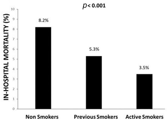 Several studies have been conducted, especially in the setting of ST-segment elevation myocardial infarction (STEMI), suggesting the existence of a “smokers’ paradox,” related to the more favorable outcome of smokers compared with non-smokers [6,7,8,9,10]. Similar findings have been observed among patients with acute ischemic stroke, acute heart failure, and cardiac arrest [11,12,13,14].