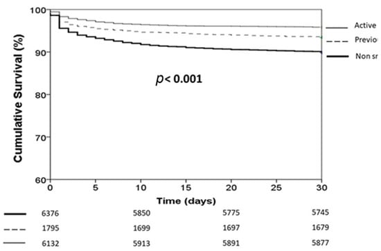 Kaplan–Meier survival curves of STEMI patients according to smoking status.