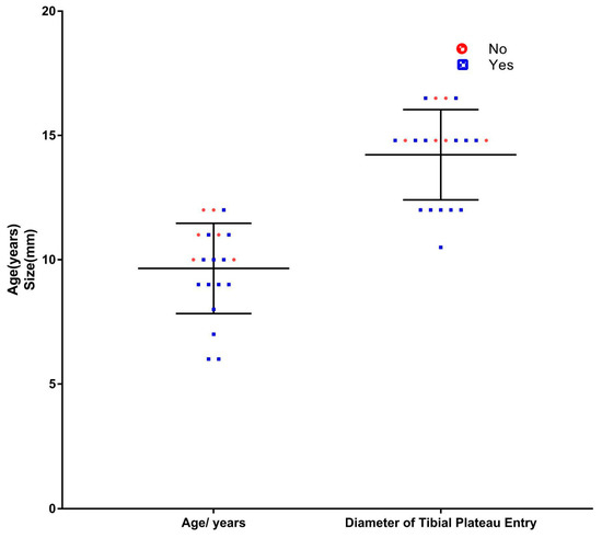 A scatter plot depicting the presence of an association between deformities and age but no significant association between deformities and tibial plateau entry diameter.