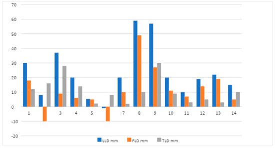 Tibial length discrepancy was discovered in 13 patients with a mean of 12 mm and a median of 10 mm (3–30 mm) (Figure 3). Only three patients had a TLD of 20 mm or greater, three had a TLD of more than 10 mm and less than 20 mm, and the remaining patients showed values of <10 mm. Twelve out of the 13 patients with LLD had concurrent TLD, contributing to 13–100% (59%) of the difference in length. In three patients, LLD was caused entirely by TLD. A histogram of the magnitude of growth disturbance indices in 14 patients is depicted in Figure 4.