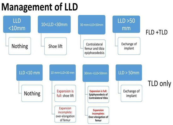A TLD of greater than 20 mm may be effectively managed by over-elongation of the expandable femur, provided adequate stroke length remains. However, in case that the expansion mechanism has reached its full capacity, epiphysiodesis may be employed. Epiphysiodesis is used to account for the residual discrepancy in patients with remaining growth potential with an efficacy of 66% at maturity in both the femur and tibia [27]. This therapeutic modality bears a complication rate of 7%, commonly resulting in the development of angular deformities [28]. Additionally, we reserve shoe lifts only when the family is opposed to epiphysiodesis, although this method is largely used in an LLD of <20 mm [29]. However, studies in skeletally mature patients have yielded no significant functional effect of this intervention [30]. A TLD of less than 20 mm is often tolerated by the patient’s compensatory mechanisms. If the total LLD was greater than 30 mm, epiphysiodesis of the contralateral distal femur alone or in conjunction with the contralateral proximal tibia might be warranted. We have utilized this treatment option in two of our patients and appreciated satisfactory results. Further elongation of the surgical femur was performed in three patients to correct operative limb shortening caused by TLD (Figure 8).