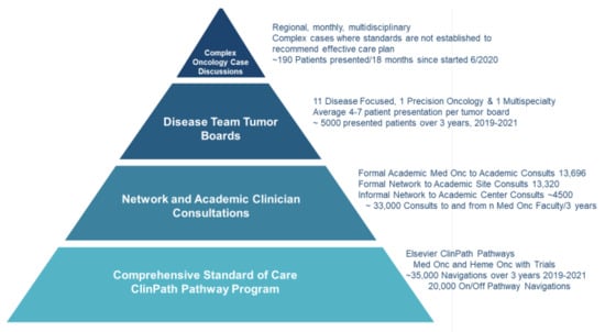City of Hope has an enterprise commitment to democratize cancer care delivery by providing expert faculty knowledge to clinicians and their patients at every network site regionally, nationally, and internationally. Challenges from the COVID-19 pandemic, health plan restrictions, and our expanding geographic network of sites led to the development of a four-tiered Pyramidal Decision Support Framework (Figure 1) to expand the superior overall survival in every cancer type and stage seen at the academic center to the enterprise’s growing network [23,24,25,26,27]. The pyramid is based on providing robust evidence-based pathways for the most common cancer presentations, enabling the availability of formal and informal faculty consultations, providing disease-specific and precision oncology tumor boards, and instituting our newest component, regional Complex Oncology Case Discussions (COCD), where multispecialty expertise is provided for patients’ presentations at a physician’s request when standards of care do not exist.