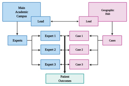 Process-wise, two leads at the regional network site along with the site administrator gather the individual cases and any specific questions from the regional network practitioners before convening the COCD. The leads assess the individual cases and determine the expertise that is required to attend the COCD and notify these experts 2–5 days before the meeting. The network practice physicians and administrators work with the academic site thinktank supervised by the disease team leaders and the chairs of the departments to invite the experts requested. While 4–6 leads are permanently assigned to the multidisciplinary team, other leads and experts of rare diseases such as brain cancer, sarcoma, melanoma, and head and neck cancers are invited as needed. The COCD is then convened virtually, and cases are assessed to answer any questions and determine the plan of care based on the consensus between the network practice and the academic site physicians (Figure 3).