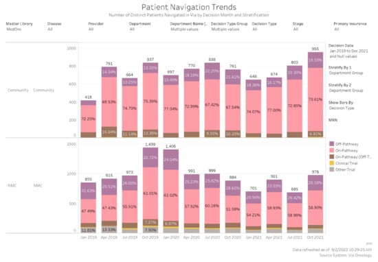 Evidence-Based Pathways (EBP): The data sent from ClinPath to our enterprise data warehouse (EDW) weekly are presented in Tableau reports according to the clinician, practice, region, network, and academic site, and according to the navigation choice for enterprise, Duarte academic center, and the network as well as its individual sites. Disease navigations can be reported for quarterly, annual, and time-bounded periods.