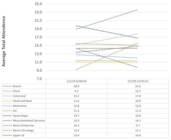 To characterize the impact of the transition from in-person only TBs to virtual TBs, the average TB attendance was compared between the 1 January 2019–30 June 2020 time period and the 1 July 2020–31 December 2021 time period (Figure 6). Absolute changes in the attendance of between −1 to 1 participant were considered stable. Of the eleven TBs, the attendance at four TBs increased while it remained stable in five TBs and decreased in two TBs. The largest increase in attendance occurred in the breast TB, with an average increase of 4.7 attendees (p < 0.001), while the largest decrease was −4.6 attendees in the neuroendocrine TB (p < 0.001). On average, across the eleven TBs, attendance increased by 0.6 attendees (p < 0.001).