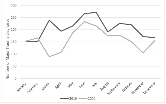 In 2020, a significant reduction in the number of major traumas compared to 2019 (2463 vs. 1897; p < 0.05) was observed.