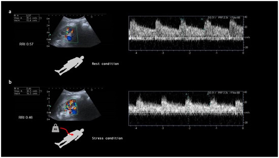 Renal Stress Test (RST) is based on the measurement of the percentage change in the intraparenchymal renal resistive index (IRRIV) between the basal status in rest condition (a) and after an external stress to study the RFR (b). In resting conditions (a), the RRIs are measured by studying the average value which is then used to calculate the percentage and absolute variation with respect to the values found after the stress (b) applied to the kidney through the application of the weight on the anterior abdominal wall. The figure shows the sampling points of the Doppler signal in the kidney and the relative Doppler spectra that are used for the calculation of the RRI.