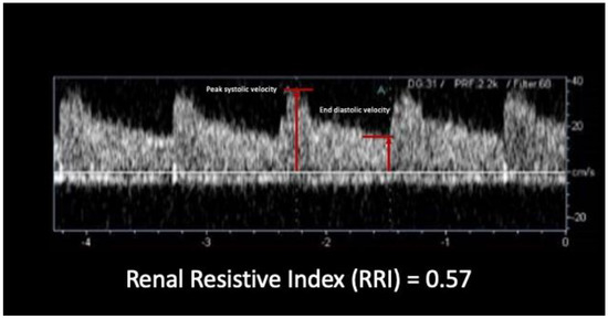 - Tublin, M.E.; Bude, R.O.; Platt, J.F. Review. The resistive index in renal Doppler sonography: Where do we stand? AJR Am. J. Roentgenol. 2003, 180, 885–892. [Google Scholar] [CrossRef]