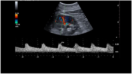 The RRI measurement was performed by one trained sonographer using a multi-frequency convex probe and the same ultrasound machine in controlled environmental conditions (HI Vision Ascendus—Hitachi with probe C715 model—constant ambient temperature of 21 °C). RST was performed in the patient in supine position after a rest period of at least 15 min. RRIs were manually measured for all patients excluding the automatic software. The RRI were calculated by the built-in software as the following formula: RRI = [(peak systolic velocity − end diastolic velocity)/peak systolic velocity], in which peak systolic velocity and end diastolic velocity were measured in the same wave (Figure 2). The basal RRIs were measured on superior, middle, and inferior interlobular arteries in each kidney and the mean value was considered as the baseline value (baseline RRI). Both kidneys were analyzed to identify the mean baseline value. If there were no differences greater than 0.02 between the two mean values, the test was performed on the right kidney only. In our population, all patients presented a difference ≤0.02 in the basal value of RRI.