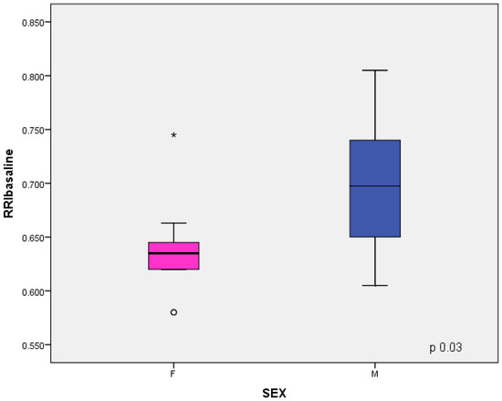 RRI in male and female patients. Box plot showing the differences of RRI baseline between male and female subsamples. Comparison with Student’s t-test for independent samples showed that males had higher baseline RRI values than females. * and ○ are two extreme values.