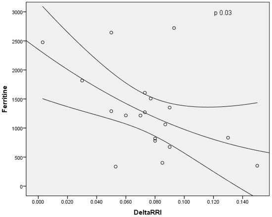 Inverse correlation between mean ferritin values and Delta RRI. Dot plot illustrating the correlation between mean ferritin values and Delta RRI (R = −0.51, p = 0.03).