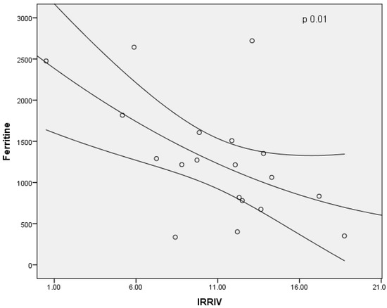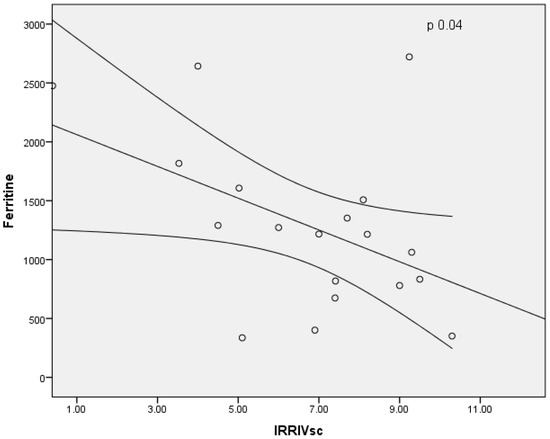 Inverse correlation between ferritin and IRRIV values. Dot plot illustrating the correlation between men ferritin and IRRIV values (R = −0.57, p = 0.01).