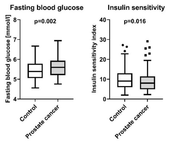 The matching of patients with PCa to similar participants without PCa was performed using a nearest match procedure with the package “MatchIt” in R (http://www.jstatsoft.org/v42/i08/, accessed on 12 January 2019). Statistical analyses were conducted using JMP 14.0 (SAS Institute Inc., Cary, NC, USA). Associations of PCa status with basal glucose and insulin sensitivity were tested in multivariate linear regression analyses of log-transformed data with adjustment for age and BMI, while associations with insulin secretion were tested after adjustment for age and insulin sensitivity. A p-value < 0.05 was considered to be statistically significant.