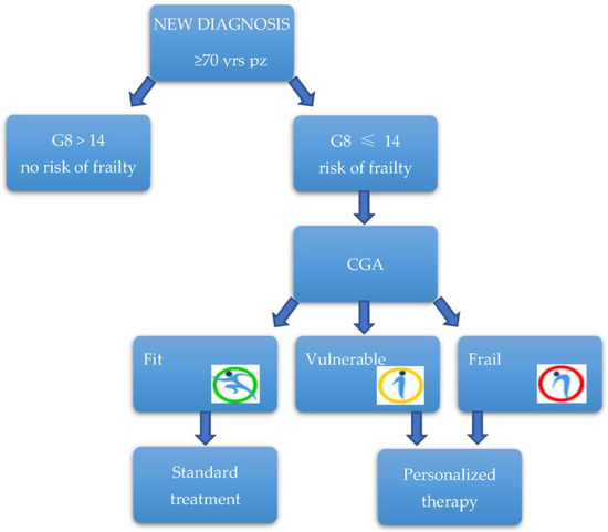 All older patients (≥70 years old) admitted to the Gemelli ART were screened for frailty by the G8 screening tool: if the patient appeared not to be at risk, standard treatment will be offered; otherwise, if the patient is at risk of being frail, an oncogeriatric visit and a comprehensive geriatric assessment (CGA) were performed (Figure 1).