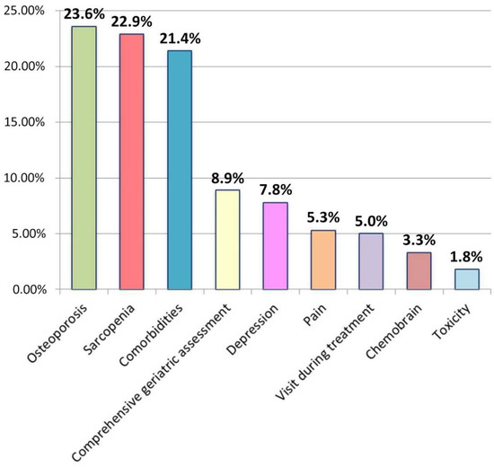 In 2020, Gemelli ART underwent 60,319 radiation-oncology treatments, admitted 943 patients in the radiation-oncology and supportive care ward, and treated and followed 15,268 patients in clinics. We observed an increase in the number of older patients treated with standard treatments and in the number of patients admitted, with a reduction in the average length of stay of these patients from 20.6 days in 2016 (last year before the restructuring and reorganization of the units) to 13.2 days. In 2021, 1196 patients were assessed for their frailty before starting radiation-oncology treatments, 847 were admitted for toxicity or to undergo oncological treatments, 349 patients were evaluated within the geriatric oncology and supportive care outpatient clinic, for a total of 597 visits (258 first contact and 339 follow-ups). The mean age was 75 years; all patients aged ≥ 70 were assessed by a G8 screening test, and patients at risk of being frail at G8 were assessed by a comprehensive geriatric assessment, and it was found that 59.2% were fit, 31.6% were vulnerable, and 9.2% were frail, following Balducci’s criteria [21]. The reasons for outpatient evaluations are shown in Figure 2. The cancer type is shown in Figure 3.