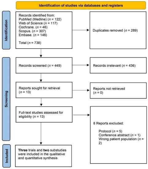 A total of 738 studies were identified from PubMed (122), Web of Science (117), Cochrane (46), Scopus (307), and Embase (146). After removing duplicates (289), 449 records underwent title and abstract screening from which 436 were identified as irrelevant. Leaving 13 records to be considered by full-text screening excluding eight of them. Finally, we included three RCTs and two substudies in qualitative and quantitative data synthesis. The PRISMA flow chart of the detailed selection process is demonstrated in (Figure 1).