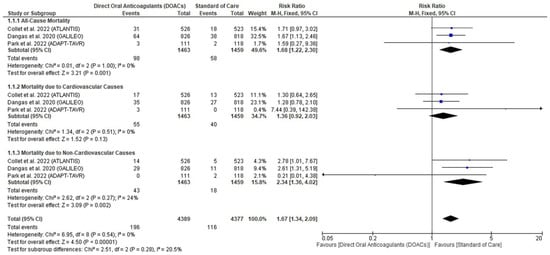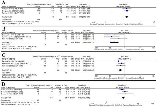 Recently, the decreased incidence of reduced leaflet motion (RLM) and hypoattenuated leaflet thickening (HALT) using the DOACs, such as the most commonly used factor Xa inhibitors, appears promising in improving valve durability and hemodynamics [,,,,]. However, DOACs have been associated with an increased risk of mortality and adverse cardiac events in patients without an indication for OAC after TAVR. Therefore, we aim to evaluate the safety and efficacy of DOACs in patients without an indication of OAC after TAVR.
