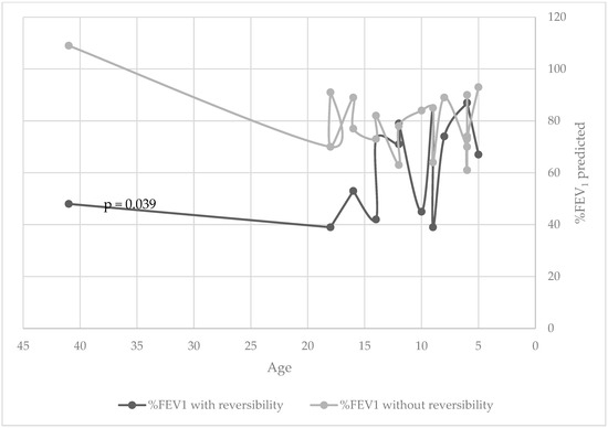 The median age was 13.5 (5–41) years among the patients with %FEV1 predicted ≥ 10%, and age 11 (5–48) years among those with %FEV1 predicted < 10%; this difference was not statistically significant. In an analysis that matched patients according to age, airway reversibility correlated with worse %FEV1 predicted (p = 0.039) (Figure 1).