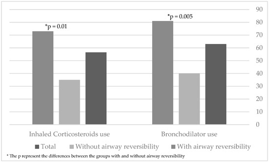 Of the 46 patients evaluated, 29 (63%) were using bronchodilators (Figure 2). Of them, 21 (72%) demonstrated reversible airway obstruction. Of the 26 patients with reversible airway obstruction, 21 (80%) were using inhaled bronchodilators (p = 0.005) (Figure 2).