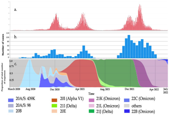 - The Proportion of Total Number of COVID-19 Sequences OVER time in Poland. Available online: https://covariants.org/ (accessed on 21 July 2022).