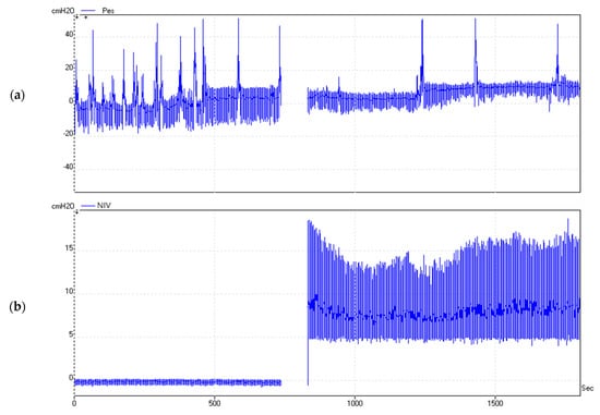 Isolated signal artefacts were reported in all patients, with some having a clear cause such as swallowing, coughing, or body movements. For example, swallowing led to a transitory increase in the absolute values of Pes of up to 20 cm H2O. Coughing led to a much more significant rise in Pes of up to 30 cm H2O measured from the mean ∆Pes. Some patients presented with additional artefacts during spontaneous breathing, for which we could not identify the clinical trigger. Interestingly, most of these unexplained artefacts disappeared during NIV. This could be related to either the variable elastance of the esophagus wall and possibly inadequate filling volume of the balloon or the esophageal contractions [18,19].