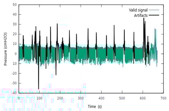 We identified signal areas with multiple artefacts. Disproportional oscillations of the Pes values were recorded in amplitude and duration (Figure 2). These artefacts were encountered regardless of the patient’s position or the presence of ventilator support. Most artefacts could be related to specific events such as swallowing, coughing, or the movement of the trunk. Consequently, we conducted artefact removal by applying the described digital filter. Figure 2 shows the remaining Pes signal after artefact removal.