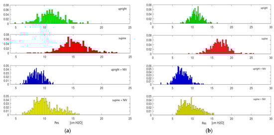 ∆Pes values in supine vs. upright positions were higher in the absence of NIV. This was previously described in healthy subjects [22] and is justified by the fact that in the supine position, respiratory muscle strain is increased through reduction of functional residual capacity, increase in elastic recoil of the thoracic cage, increase in abdominal pressure, and reduction of lung compliance [23,24].