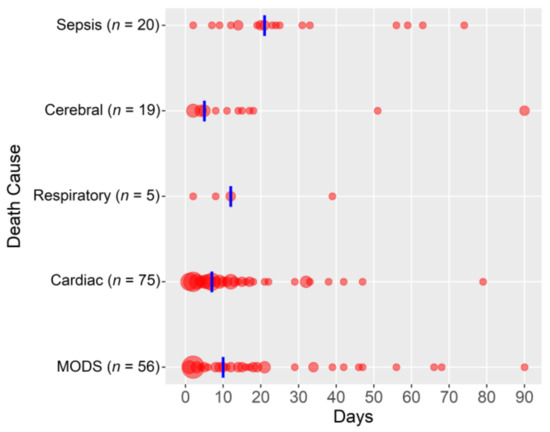 Causes of death (in-hospital mortality; circle size depends on the number of patients; the vertical blue line presents the median; n = 175, missing data: 4/453). Abbreviations: MODS, multiple organ dysfunction syndrome.