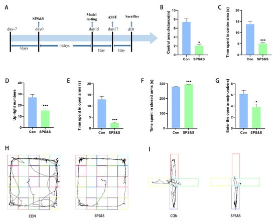 Effects of SPS&S procedure on rat behaviors. (A): The timeline of the experimental process and the events that occur at important points in time. Model testing includes an open field test (OFT) and elevated plus maze test (EPMT). After the unified behavioral test, the brain is taken, and molecular detection is carried out. Behavioral tests results are shown the movement distance and time spent by the rats in the center of the OFT (B,C), the up-right numbers of rats in the OFT (D), the time spent by rats in open arms and closed arms in the EPMT (E,F), the number of times the rats entered open arms in the EPMT (G). The (H,I) diagrams showed the movement tracks of the rats in the OFT and EPMT, respectively. The results are expressed as mean ± standard deviation. * p < 0.05 and *** p < 0.001.
