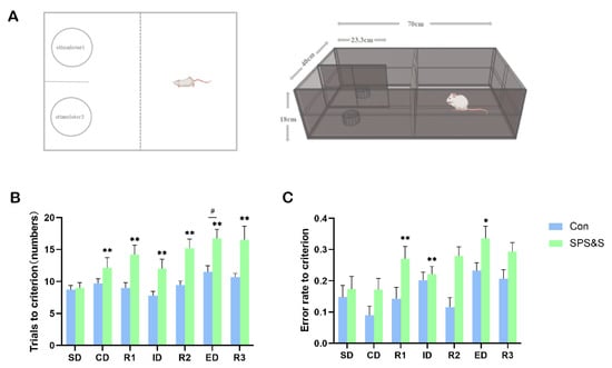 Effects of SPS&S on the performance of the ASST in rats. ASST experimental device (A); the number of trials to criterion (B), error rate to criterion (C). The data are expressed in terms of mean ± SEM. * p < 0.05, ** p < 0.01 compared to SPS&S group on the same stage; # p < 0.05 compared to ID phase on the same group. The rats were required to perform six consecutively correct responses in each stage before moving on to the next stage, from simple discrimination (SD) to compound discrimination (CD), reversal 1 (R1), intra-dimensional (ID) shift, reversal 2 (R2), extra-dimensional (ED) shift, and finally, reversal 3 (R3).