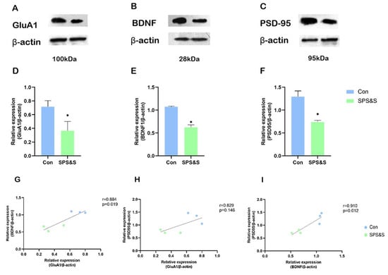 Effects of SPS&S on the GluA1, BDNF, and PSD-95 protein levels in the mPFC. The representative blots for GluA1 (A), BDNF (B), and PSD-95 (C); GluA1 (D), BDNF (E), and PSD-95 (F) protein levels measured by Western blot analysis. (G–I) show the correlation between different proteins. Data are represented as mean ± SEM. * p < 0.05.