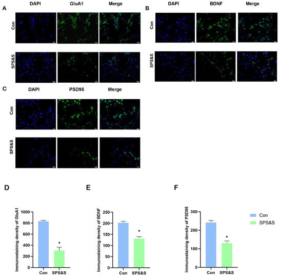 Effects of SPS&S on fluorescence intensities of GluA1, BDNF and PSD-95 protein levels in the mPFC (400×, bar scale 20 um). The localization and distribution of GluA1 (A), BDNF (B), and PSD-95 (C) in mPFC. The data of the immunoreactivity analysis of GluA1 (D), BDNF (E), and PSD-95 (F) in mPFC. Data are also represented as mean ± SEM. * p < 0.05.