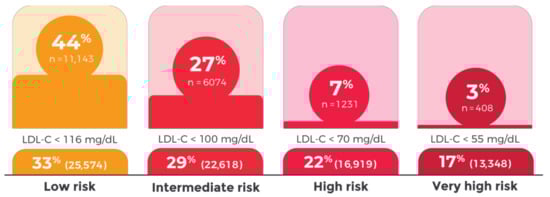 Despite the described LLT use, only 24% of the patients achieved the LDL-C targets set by the 2019 ESC/EAS Guidelines for the management of dyslipidemias. In patients with very high CVD risk, only 3% achieved LDL-C levels <55 mg/dL (5% in patients with ASCVD). With respect to patients with high, intermediate, and low CVD risk, 7%, 27%, and 44% achieved their CVD level LDL-C targets, respectively (Figure 1).