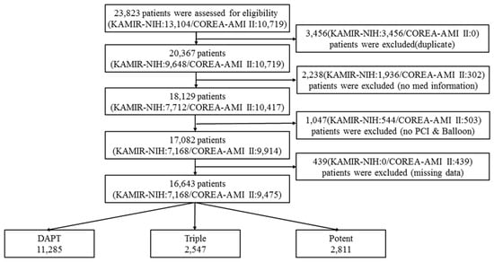 In the present study, the eligibility of AMI patients from the Korea AMI Registry-National Institutes of Health (KAMIR-NIH) and Cardiovascular Risk and Identification of Potential High-Risk Population in AMI (COREA-AMI) registries was assessed. The KAMIR-NIH registry is a prospective, multicenter, web-based observational cohort study for the prognostic evaluation of AMI patients at 15 centers in Korea [12]. The COREA-AMI registry was designed to analyze the real-world, long-term, clinical outcomes in all consecutive patients with AMI at nine major cardiac centers in Korea performing high-volume PCI. The COREA-AMI I registry included AMI patients who received PCI from January 2004 to December 2009, and the COREA-AMI II registry extended the follow-up period of COREA-AMI I patients and additionally enrolled AMI patients between January 2010 and August 2014. Epidemiologic, angiographic, and follow-up clinical outcome data of all AMI patients were consecutively registered in the electronic, web-based case report system. A total of 23,823 patients were assessed for eligibility (Figure 1). We excluded 3456 patients with duplicates in both registries, 2238 without medication information, 1047 without PCI procedure, and 439 with missing data. Patients were divided into three groups based on antiplatelet regimens: DAPT (aspirin and clopidogrel, n = 11,285, 67.8%), Triple (aspirin, clopidogrel, and cilostazol, n = 2547, 15.3%), and Potent (aspirin and ticagrelor or prasugrel, n = 2811, 16.9%). The KAMIR-NIH study and the COREA-AMI study were conducted in accordance with the Declaration of Helsinki. Independent statisticians at the Clinical Research Coordination Center managed the final dataset, and clinical research associates sealed it with code. All participants were provided written informed consent, and the study was approved by the Institutional Review Board at each participating center. The COREA-AMI registry is registered on ClinicalTrials.gov (study ID: NCT02806102).