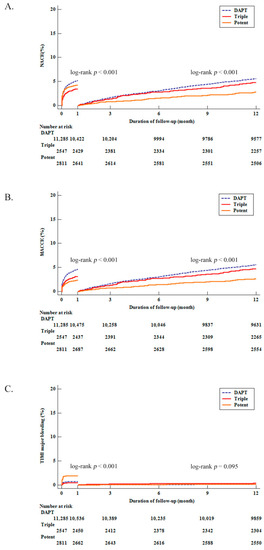 The incidence of MACCEs at the one-month follow-up was 4.6%, 3.1%, and 2.4% for the DAPT, Triple, and Potent groups, respectively. In addition, the incidence of TIMI major bleeding was 0.7%, 0.5%, and 1.9% for the DAPT, Triple, and Potent groups, respectively at the one-month follow-up. Accordingly, the incidence of NACEs at the one-month follow-up was 5.2%, 3.4%, and 4.2% for the DAPT, Triple, and Potent groups, respectively (Table 2). Regarding NACEs, MACCEs, and TIMI major bleeding, the differences between the three groups were significant within one month based on the Kaplan–Meier curve analysis (log rank p < 0.001, log rank p < 0.001, log rank p < 0.001, respectively, Figure 2). After adjusting covariates with a multivariate Cox hazard regression model, MACCEs at the one-month follow-up did not show statistically significant differences in the groups (Table 3). However, the risk of TIMI major bleeding was significantly higher in the Potent group than in the DAPT group (HR 3.043, 95% CI 2.119–4.369, p < 0.001) and the Triple group (HR 4.009, 95% CI 2.119–7.585, p< 0.001) at the one-month follow-up; risks between the DAPT and Triple groups were not significantly different. Accordingly, NACEs were significantly higher in the DAPT and Potent groups than in the Triple group at the one-month follow-up (DAPT; HR 1.265, 95% CI 1.006–1.591, p = 0.044; Potent; HR 1.515, 95% CI 1.142–2.011, p = 0.004) without a significant difference between the DAPT and Potent groups. After one month, differences were not observed in the MACCE, TIMI major bleeding, and NACE rates between Triple and Potent groups. However, compared with the Potent group, MACCEs and NACEs were significantly higher in the DAPT group. Propensity score matching analysis for the Triple and the Potent group was performed, and the results were the same as before (Table 4).