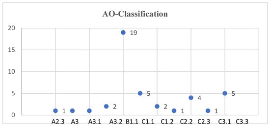 Among the 42 cases, 5 fractures according to AO classification 11A were present (1 × 11A2, 4 × 11A3, 12%). In 19 cases we observed the fracture type 11B1 (45.2%). C fractures were present in a total of 42.9%, including 7 × 11C1 (16.7%), 5 × 11C2 (12%), and 5 × 11C3 (12%) (Figure 2).