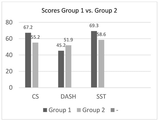 Based on the classification according to the results of the radiological parameters, the score results were compared between the groups “anatomical/acceptable” (group 1) vs. malreduction (group 2). The mean CS of Group 1 was 67.2 (±22.4, min.: 16, max.: 99) and the result of group 2 was 55.2 (±22.5, min.: 19, max.: 88). Even if there was an observed difference of at least 10 points between the two groups with worse results for group 2, no statistically significant difference was observed (p = 0.095). Additionally, non-significant differences were found in DASH Score between the two groups. The DASH in group 1 was 45.2 (±24.4, min.: 24.1, max.: 100), in group 2 51.9 (±21.9, min. 24.1, max. 91.4), indicating a better result for group 1, but no statistical significance was observed (p = 0.307). Additionally, the SST showed with an average value of 69.3 (±30.1, min.0, max. 100) for group 1 and 58.6 (±24.2, min.: 8.3, max.: 91.7) for group 2 no significant differences (p = 0.400) (Figure 4, Table 5).