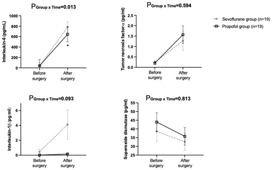 The interaction of group and time in serum IL-6 levels was significant between the groups (p = 0.013). The post-hoc Bonferroni correction revealed that the level were significantly lower in the propofol group at immediately after surgery, compared with the sevoflurane group. There were no differences in the IL-1β, TNF-α, or SOD levels between the groups (Figure 2).