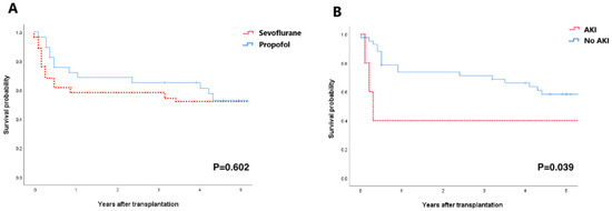 According to Kaplan–Meier estimates, the 5-year survival rate did not differ between the propofol group and the sevoflurane group (Figure 3A); however, patients who developed post-operative AKI had a significantly lower 5-year survival, compared to those that did not develop AKI (log-rank p = 0.039, Figure 3B).