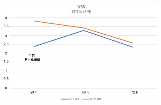 NRS were lower in the SSTS group compared to cFNB group at each time points measured with significant different in T1 (p = 0.008) *.