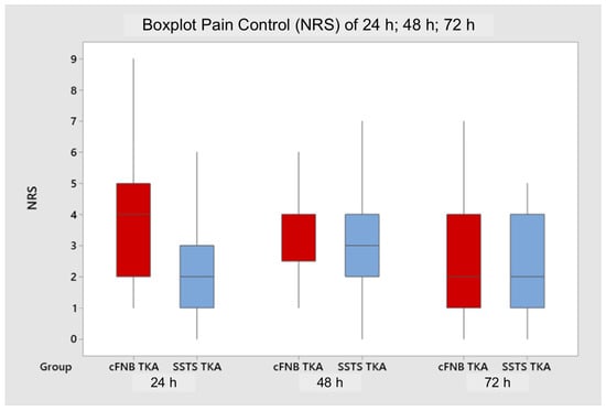 Boxplot analysis of pain control at 24 h, 48 h, and 72 h between the two groups. Horizontal line represents mean value, and the square box represents interquartile range.