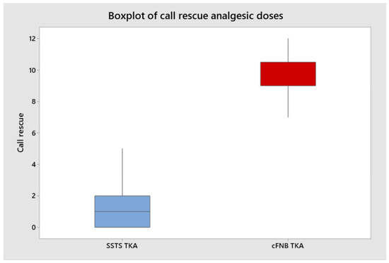 Boxplot analysis rescue doses between the two groups. Horizontal line represents mean value and the square box represents interquartile range.