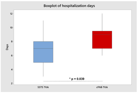 Boxplot analysis hospitalization between the two groups. Horizontal line represents mean value, and the square box represents interquartile range. (p = 0.039) *.