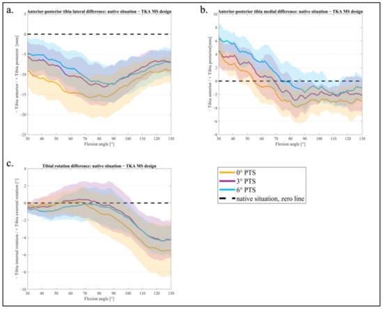 In the range representing a normal gait (up to 70° flexion), the tibial rotation was similar to that of the native situation (values around the zero line) for all PTS variants (Figure 5c). At a higher flexion of the knee joint, it was noticeable that the 3° PTS variant, especially, was closer to the native situation in tibial rotation.