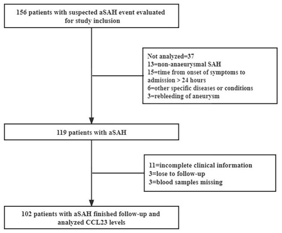 Of all aSAH patients, 156 patients were initially enrolled, and 54 of them were removed based on the exclusion criteria. The flowchart is detailed in Figure 1. 102 aSAH patients and 61 controls were finally included in the study. The baseline characteristics of patients are shown in Table 1. No significant differences were observed between patients with aSAH and controls in terms of age, sex, body mass index (BMI), and prior medical history.