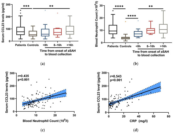 Neuroinflammation is a central component of aSAH [6,31]. The activation and infiltration of neutrophils can express CCL23 and exacerbate brain injury following aSAH [14,17]. Thus, we attempt to ascertain the relationship between serum CCL23 levels and neutrophils in inflammation after aSAH. We found that blood neutrophil level showed the trend of a continuous increase during 24 h after aSAH, which was similar to serum CCL23 levels (Figure 2b). Subsequently, the intimate association between serum CCL23 levels, blood C-reactive protein (CRP) levels, and neutrophil count was observed, as shown in Figure 2c,d.