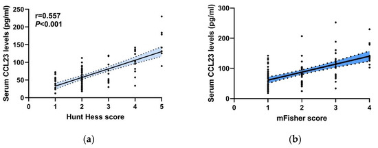 We next sought to explore whether serum CCL23 levels were related to initial clinical severity following aSAH. The initial clinical severity of patients was revealed by the Hunt–Hess score and modified Fisher (mFisher) score on admission. As shown in Figure 3a,b, serum CCL23 levels were positively correlated with the Hunt–Hess score and mFisher score, indicating that serum CCL23 levels were intimately related to the initial clinical severity of aSAH.